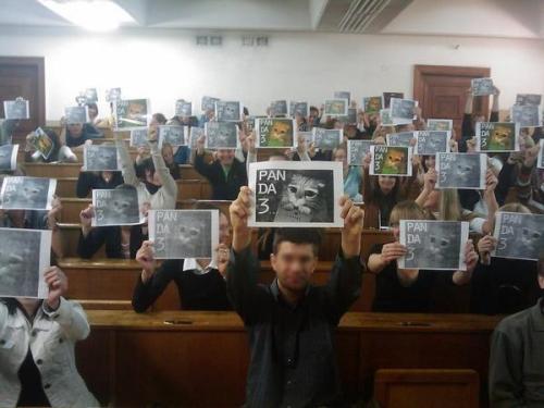 Sesja 2009, zdjęcie zrobione na Politechnice Wrocławskiej. Tylko czemu idą na łatwiznę? Kot to jednak nie panda. Poza tym większość przygotowała czarno-białe kserówki. A wszyscy też mało ambitnie - na Uniwerku byłoby "panda 5"?