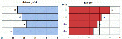Zad. 2. (2 pkt) Do przedszkola "Puchatek" uczęszcza 132 dzieci. W tabeli przedstawiono liczby dziewczynek i chłopców w poszczególnych grupach wiekowych. Narysuj piramidę populacji dzieci z przedszkola "Puchatek".