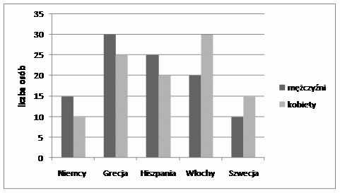 3. a) Włochy i Grecja, b) żaden, c) Niemcy, 10% d) Grecja oraz Niemcy i Szwecja, e) kąty środkowe: 10% - 36°, 15% - 54°, 20% - 72°, 25% - 90°, 30% - 108°, f) Niemcy i Szwecja - 12,5%, 45°; Hiszpania - 22,5%, 81°; Włochy- 25%, 90°; Grecja - 27,5%, 99°