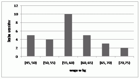 4. a) 30, b) 6, c) 20, d) nie wynika z danych, e) nie wynika z danych, f) 5, g) waga w przedziale [55, 60), h) tak