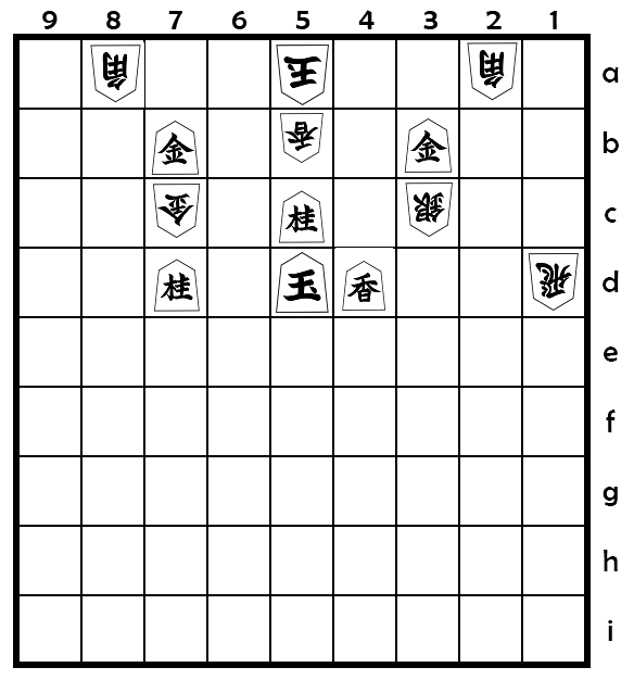 Zad. 3. Przypomnij sobie definicje szacha i mata podane w odcinku ligi z października 2016. W shogi są one takie same, jak w dobutsu shogi czy w tradycyjnych szachach. Jaki ruch należy wykonać w poniższej sytuacji, aby zamatować króla przeciwnika? Pozornie zadanie ma wiele rozwiązań, ale należy pamiętać o bezpieczeństwie własnego króla. Podaj poprawny matujący ruch.
