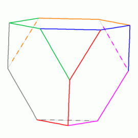 Wielościan ten ma 18 krawędzi, więc do wykonania modelu potrzebować będziemy sześciu wyciorów. Nie trzeba jednak aż sześciu kolorów – wystarczą trzy. Gotowy model przedstawia fot. 11. Zauważmy, że środkowa część wyciora odpowiada krawędzi, wzdłuż której stykają się ściany sześciokątne. Pozostałe części to krawędzie styku ściany sześciokątnej i trójkątnej.