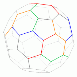 W analogiczny sposób można podzielić krawędzie dwudziestościanu ściętego (rys. 12). Ma on ich aż 90 i po podziale otrzymamy 30 grup. Na rys. 13 wyróżnionych jest 10 takich grup.