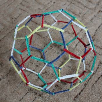 Do wykonania modelu potrzeba 30 wyciorów (po 6 w każdym z pięciu kolorów). Podobnie jak poprzednio, środkowa część wyciora odpowiada krawędzi, wzdłuż której stykają się dwa sześciokąty. Skrajne części to krawędzie styku ściany sześciokątnej z pięciokątną. Wykonanie modelu wymaga sporej staranności. Po połączeniu w całość wszystkich elementów model zapewne będzie się deformował. Na szczęście wyciory są elastyczne i z łatwością można wyrównać długości poszczególnych krawędzi, a przede wszystkim właściwie uformować kąty, pod którymi wyciory powinny być pozaginane. Korekt należy dokonywać do czasu, aż otrzymany model zacznie się nam podobać (fot. 14).