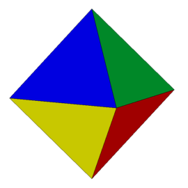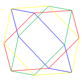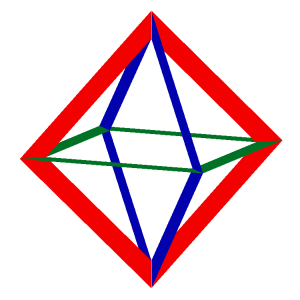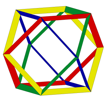 Zacznijmy od spojrzenia na ośmiościan foremny (rys. 1). Chwila obserwacji prowadzi do wniosku, że jego krawędzie można pogrupować po 4 w ten sposób, że otrzymamy 3 kwadraty (rys. 2 i 3).