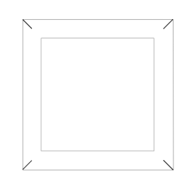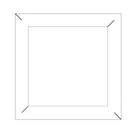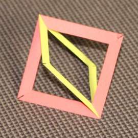 Okazuje się, że model ten można z łatwością wykonać bez użycia kleju poprzez połączenie ze sobą trzech odpowiednio ponacinanych ramek. Kwadraty przecinają się wzajemnie wzdłuż przekątnych (rys. 5). Aby można było je połączyć należy je w odpowiedni sposób ponacinać. Pierwszy kwadrat nacinamy tak, jak na rys. 6. Nacięcia zawierają się w przekątnych i prowadzą do połowy szerokości ramki.