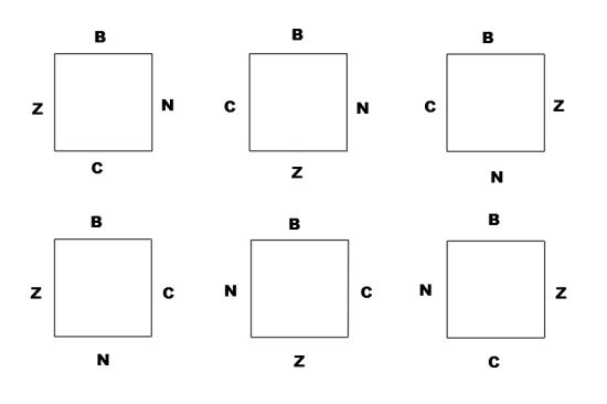 Model kolorowy ma interesujące własności kombinatoryczne. Mając do dyspozycji cztery kolory (powiedzmy, że są to B, N, C, Z) możemy boki kwadratu pomalować tymi kolorami na sześć różnych sposobów (z dokładnością do obrotów) – rys. 19.