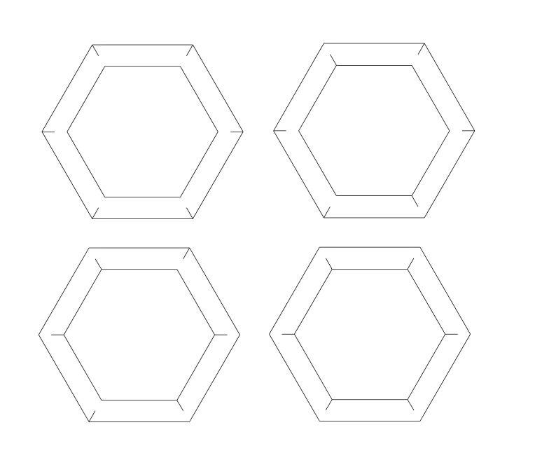 Przygotowanie tych ramek nie jest istotnie trudniejsze. Podobnie jak wcześniej sześciokąty przecinają się wzdłuż przekątnych (głównych). Tak też należy wykonać nacięcia. Pierwsza ramka ma wszystkie szczeliny od zewnątrz (rys. 15). Druga musi mieć jedną parę szczelin od wewnątrz (rys. 16).