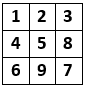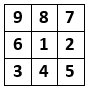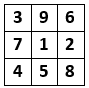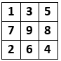 Zad. 2. W polach tabeli 3×3 rozmieść cyfry od 1 do 9 (każdą raz) tak, aby utworzyły kwadrat antymagiczny, tzn. aby sumy liczb w każdym wierszu, kolumnie i na obu przekątnych były za każdym razem inne.