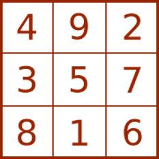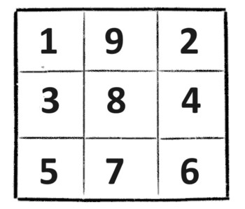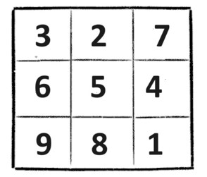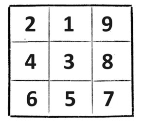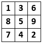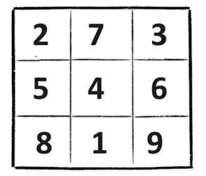 Zad. 1. W polach tabeli 3×3 rozmieść cyfry od 1 do 9 (każdą raz) tak, aby utworzyły kwadrat magiczny, tzn. aby sumy liczb w każdym wierszu, kolumnie i na obu przekątnych były takie same.