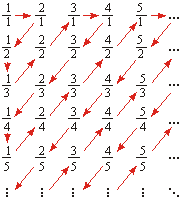 Wystarczy każdą liczbę naturalną ustawić w parze z pewnym ułamkiem, tak aby wyczerpać zbiór wszystkich ułamków. Sposób takiego ustawienia w pary (ponumerowania ułamków liczbami naturalnymi) pokazuje rysunek obok.