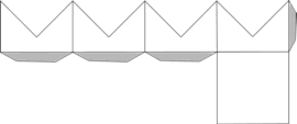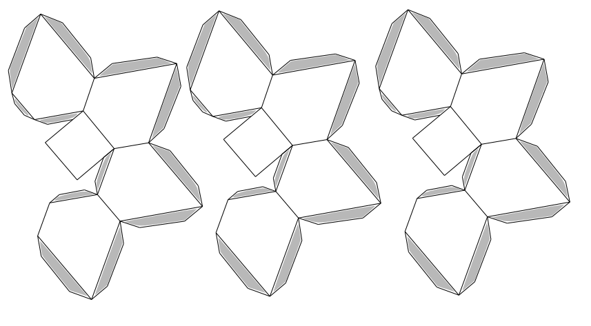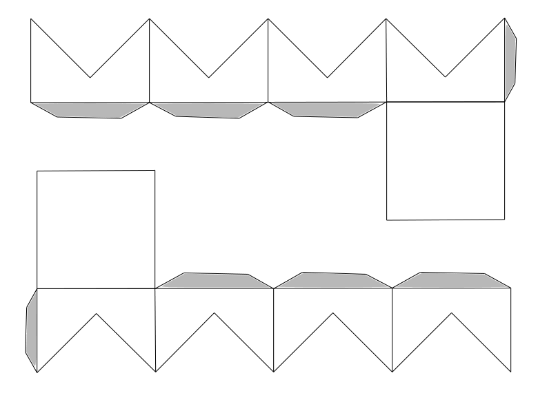 Najpierw wykonujemy część wewnętrzną, a następnie doklejamy do niej stopniowo część zewnętrzną. Kończymy, doklejając od spodu duży kwadrat zewnetrznej korony. Zostanie on doklejony do krawędzi części zewnętrznej oraz do kwadratu części wewnętrznej „korony". Kliknięcie w rys. 14 i 15 otwiera w nowych oknach większe siatki. Po wykonaniu sześciu „koron" łączymy je za pomocą podwójnych skrzydełek. Atrakcyjność modelu można podnieść, wykonując ściany trójkątne w czterech kolorach. Wymaga to oczywiście większego nakładu pracy, ale efekt końcowy wart jest poczynionych starań.