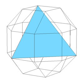 Uważne spojrzenie na otrzymaną strukturę pozwala zauważyć, że również i ona może być uzupełniona do wielościanu poprzez dodanie odpowiednich ścian. Rysunek 5 przedstawia trójkąt równoboczny wyznaczony przez 3 wierzchołki sześcio-ośmiościanu rombowego małego.