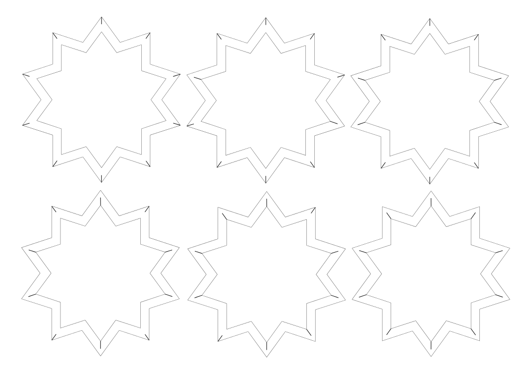 Jeżeli udało ci się zbudować model z wypukłych dziesięciokątów, to wykonanie modelu z ramek gwiaździstych. nie powinno nastręczać większych trudności. Nacinamy je i łączymy identycznie jak wcześniejsze. Zaczynamy od połączenia ramki ze wszystkimi nacięciami zewnętrznymi (rys. 13) z ramką z jedną parą nacięć wewnętrznych (rys. 14).