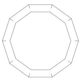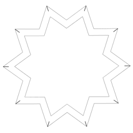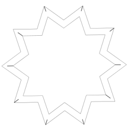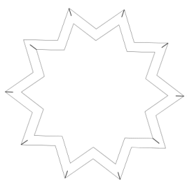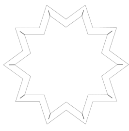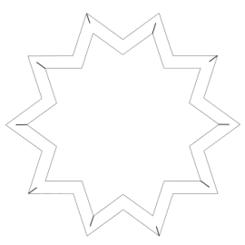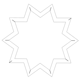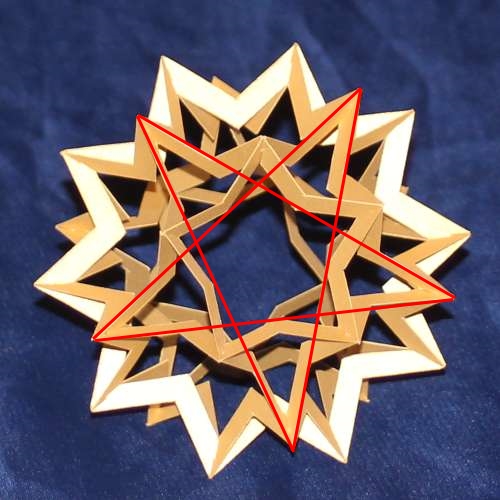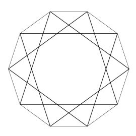 Wprowadźmy teraz małą modyfikację podstawowego elementu – zastąpmy wykorzystany tu wypukły dziesięciokąt foremny przez jego gwiaździstą wersję. Powstaje ona w wyniku poprowadzenia wszystkich przekątnych łączących co trzeci wierzchołek wyjściowego dziesięciokąta foremnego (rys. 11). Ramkę w tym kształcie przedstawia rysunek 12.