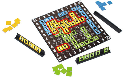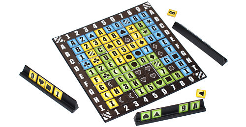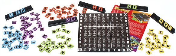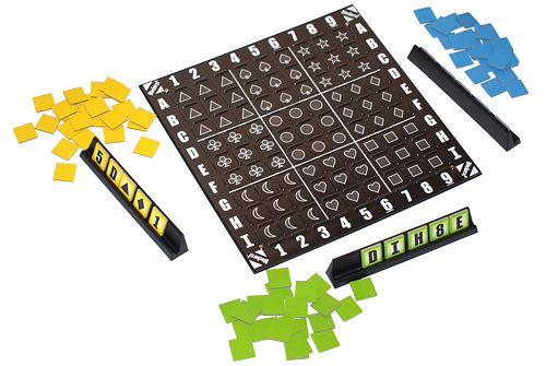 Każde pole na planszy związane jest z jakąś cyfrą, literą i kształtem, więc może być przykryte aż trzema różnymi płytkami w jednym kolorze, a kolorów w grze jest tyle, ilu graczy (czyli od 2 do 5). Plansza ma kształt kwadratu 9×9 (kolumny oznaczone są cyframi od 1 do 9, a wiersze literami od A do I). W ten sposób każde z 81 pól odpowiada jakiejś literze i cyfrze, Dodatkowo każde pole jest oznaczone jednym z 9 kształtów (koło, kwadrat, trójkąt, serce, romb, trefl, pik, księżyc i gwiazda). Symbole te pogrupowane są w kwadraty 3×3. Gracze dysponują 140 płytkami, po 28 w każdym z pięciu kolorów. Na każdej widnieje litera, cyfra lub figura albo napis BLOCKERS, oznaczający jokera. W pudełku znajduje się też 5 stojaczków na płytki oraz instrukcja.