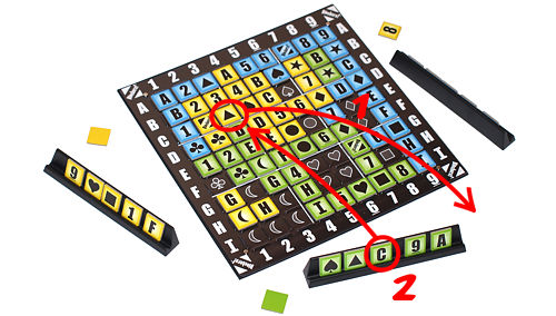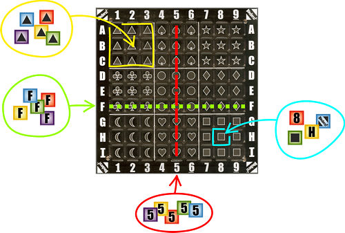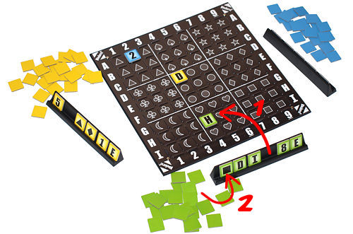 - Płytki dokładamy na planszę w następujący sposób: jeśli na płytce znajduje się cyfra, to można ją położyć jedynie w kolumnie oznaczonej tą cyfrą, jeśli na płytce znajduje się litera, to można ją położyć jedynie w wierszu oznaczonym tą literą, jeśli na płytce znajduje się kształt, to można ją położyć w kwadracie z polami oznaczonymi tym symbolem.