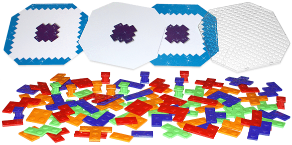 W zestawie znajdują się 72 klocki płaskie (po 18 w czterech kolorach) oraz 12 kolumn (po 3 w każdym kolorze). Klocki mają różne kształty, bo składają się z małych kwadracików, których liczba decyduje o wartości punktowej danego klocka. Są więc dwa klocki utworzone z dwóch kwadracików (domino), po dwa klocki w każdym z dwóch kształtów złożonych z trzech kwadracików (trimino), po dwa klocki w każdym z czterech kształtów utworzonych z czterech kwadracików (quatromino) i po jednym klocku każdego z czterech kształtów utworzonych z pięciu kwadracików (pentamino).