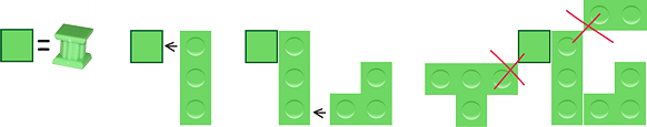- Klocki wykładamy tak, by chociaż jednym kwadracikiem przylegały do klocka lub kolumny tego samego koloru.