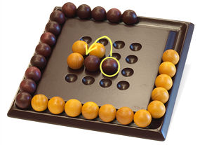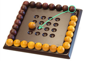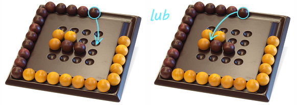 - W początkowych ruchach każdy gracz w swojej turze umieszcza jedną z kulek ze swojej puli w dowolnie wybranym zagłębieniu na planszy.
