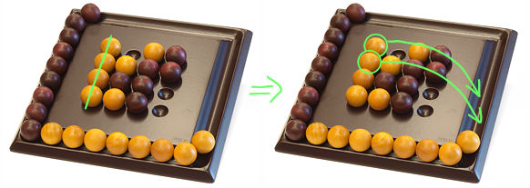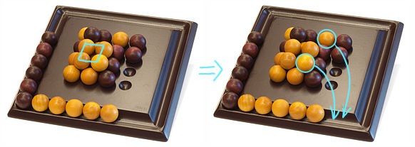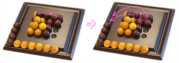 - Ponadto w swoim ruchu gracz może przełożyć jedną ze swoich kul znajdujących się na planszy na zagłębienie utworzone z czterech kul, pod warunkiem, że przeniesie ją co najmniej o jeden poziom wyżej (taki ruch pozwala zaoszczędzić kule). Przemieszczać można jedynie kulę swobodną, która nie stanowi podparcia dla kulki z wyższego poziomu.