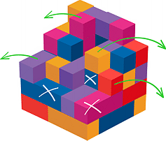 - Układ jest punktowany, jeśli zostanie stworzony z klocków w jednym kolorze. Nie muszą one leżeć w tej samej warstwie, bo wzór ocenia się, patrząc na planszę z góry i z dokładnością do obrotu.