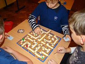 - Na planszy naklejonych jest na stałe 16 pól labiryntu. Pozostałe są ruchome i rozmieszcza się je losowo. Za każdym razem powstaje więc nowy układ z wieloma ślepymi korytarzami.