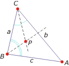 Dowód. Dwusieczne dwóch kątów trójkąta nie są równoległe, więc przecinają się. Oznaczmy punkt ich przecięcia przez P. P leży na dwusiecznej kąta C, więc w równych odległościach od boków a i b. P leży też na dwusiecznej kąta B, zatem w równych odległościach od boków a i c. Skoro P leży w tej samej odległości od boków b i c, to leży na dwusiecznej kąta A, jest więc punktem wspólnym trzech dwusiecznych.