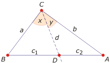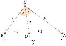 Dowód. Stosunek pól trójkątów o równej wysokości jest równy stosunkowi długości ich podstaw, na które tę wysokość opuszczono. Zatem $\frac{P_{\triangle ADC}}{P_{\triangle BCD}}=\frac{c_2}{c_1} $. Ze wzoru na pole trójkąta lewą stronę można zapisać jako $ \frac{\frac{1}{2} bd\sin x}{\frac{1}{2} ad \sin x}= \frac{b}{a} $. Stąd $\frac{c_2}{c_1}=\frac{b}{a} $.