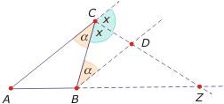 - Twierdzenie o dwusiecznej kąta zewnętrznego - w trójkącie o wierzchołkach A, B, C dwusieczna kąta zewnętrznego tworzy na przedłużeniu przeciwległego boku odcinki proporcjonalne do pozostałych boków, tzn. zachodzi: $\frac {AC}{BC}=\frac {AZ}{BZ}$.