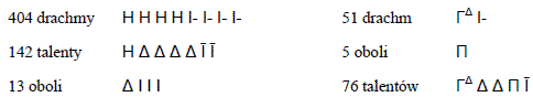 Zad. 1. Kolejno wypisuje się setki (przynajmniej do czterech), ew. pięćdziesiątkę (jeśli 50 mieści się w pozostałej setce), dziesiątki, ew. piątkę oraz jedności. Setki zapisywano literami H (od starogreckiego hekaton = "sto"), dziesiątki - Δ (od starogreckiego deka = "dziesięć"), piątki - Π (od pente = "pięć"), jedności - pionowymi kreskami, a oznaczenie pięćdziesiątki pochodziło ze zrośnięcia cyfry-litery Π ze zmniejszonym Δ. Jeśli chodziło o drachmy, do cyfr o najmniejszej wartości dopisywano jeszcze krótkie poziome kreski pośrodku z prawej, a w wypadku talentów - powyżej.