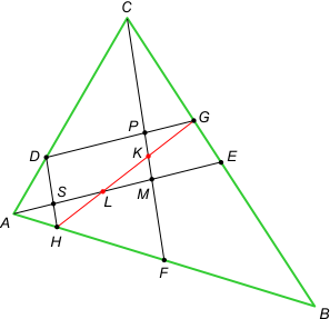 Zad. 1. Z podobieństwa trójkątów CDG i CAE (cecha kkk) otrzymujemy |DG|/|CG| = |AE|/|EC|, a z podobieństwa trójkątów CPG i CME mamy |PG|/|CG| = |ME|/|EC|. Dzieląc stronami pierwszą z tych równości przez drugą, otrzymujemy |PG|/|DG| = |ME|/|AE| = 1/3, bo M jest środkiem ciężkości trójkąta ABC. Z kolei z podobieństwa trójkątów DHG i PKG (cecha kkk) mamy |KG|/|HG| = |PG|/|DG| = 1/3, skąd |KG| = |HG|/3. Analogicznie |HL| = |HG|/3. Stąd teza.