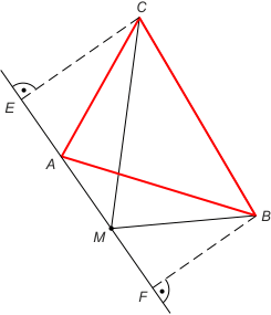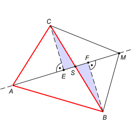 b) Niech B i C leżą po jednej stronie prostej AM. Z założenia otrzymujemy równość wysokości CE i BF, skąd wynika równoległość prostej AM i boku BC. I na odwrót, jeśli prosta AM jest równoległa do BC, to trójkąty AMB i AMC mają równe pole, bo mają wspólną podstawę i równe wysokości.