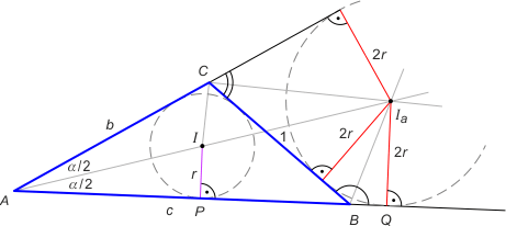 Zad. 1. W trójkącie ABC, w którym |BC| = 1, promień okręgu dopisanego stycznego do BC jest dwa razy większy od promienia r okręgu wpisanego. Wykaż, że pole tego trójkąta wynosi 2r.