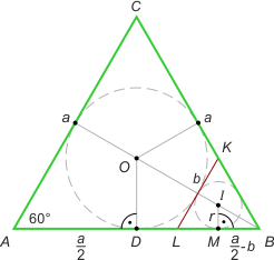 Zad. 2. Promień okręgu wpisanego w trójkąt ABC wynosi a√3/6, połowa obwodu trójkąta LBK wynosi p = a/2, a |MB| = a/2 – b (porównaj z zadaniem 2 z października 2016). Z podobieństwa trójkątów ODB i IMB otrzymujemy proporcję (a√3/6):(a/2) = r:(a/2–b), skąd mamy r = (a/2–b)√3/3. Ostatecznie SKLB = pr = a√3(a–2b)/12.