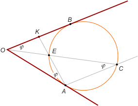Zad. 3. Zauważmy, że trójkąty OEK i OAK są podobne, bo mają wspólny kąt OKE i jeden kąt miary φ. Tak jest, bo równość miar kątów KOE i OCA wynika z równoległości prostych OB i AC, a kąt OAK jest dopisany do okręgu i oparty na łuku AE, więc jest równy kątowi wpisanemu ACE opartemu na tym samym łuku. Z tego podobieństwa otrzymujemy proporcję |OK|:|KA| = |KE|:|OK|, skąd |OK|2 = |KA|·|KE|. Z drugiej strony z twierdzenia o potędze punktu względem okręgu mamy |KB|2 = |KE|·|KA|. Stąd |OK| = |KB|.