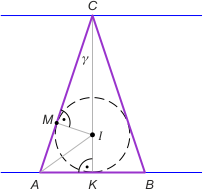 Z podobieństwa trójkątów prostokątnych MIC i AKC mamy |AK|:|KC| = |IM|:|MC|. Po podstawieniu danych liczbowych otrzymujemy (|AB|/2):(48/5) = (8/3):√((104/15)2 – (8/3)2), skąd |AB| = 8.