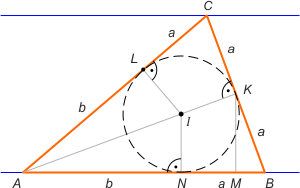 Zauważmy, że SABC = (2a+b)·8/3 = (a+b)·24/5, skąd a = 4b. Zatem |AB| = 5b. Z twierdzenia Pitagorasa w trójkącie ABK otrzymujemy |AK| = 3b. Z podobieństwa trójkątów AIN i AKB (prostokątne i mają wspólny kąt ostry KAB) mamy |IN|:|AN| = |BK|:|AK|, a po podstawieniu danych liczbowych (8/3)/b = 4b/3b, skąd b = 2. Ostatecznie |AB| = 10.