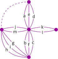 Zad. 3. a) Tak. Plan miasta można przerysować w formie grafu (patrz rysunek poniżej), którego dwa wierzchołki mają rzedy nieparzyste (3 i 5), a pozostałe mają rzędy parzyste. Rząd wierzchołka to liczba wychodzących z niego krawędzi (mostów). Jeśli graf nie ma wierzchołków rzędu nieparzystego (nazywamy go eulerowskim), to spacer po jego krawędziach można odbyć, zaczynając od dowolnego wierzchołka i kończąc w tym samym wierzchołku. W jaki sposób taki spacer zaplanować? Jeśli graf ma dokładnie dwa wierzchołki rzędu nieparzystego (nazywamy go półeulerowskim), spacer po nim jest możliwy, jeśli zaczniemy go w jednym z nieparzystych wierzhołków, a skończymy w tym drugim. Możliwą trasę na ponizszym rysunku wskazuje porządek alfabetyczny. W innych przypadkach graf jest nieeulerowski i spacer po jego krawędziach nie jest możliwy.