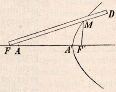 b) hiperbolograf Apoloniusza z Pergii - składa się z pręta o jednym końcu A zaczepionym w punkcie F, wokół którego pręt może się obracać, nierozciągliwej nitki o stałej długości d, której jeden koniec zaczepiony jest w drugim końcu pręta B, a drugi przymocowany w punkcie F', ruchomego rysika M zamocowanego na pręcie, o który to punkt zaczepiona jest nić w taki sposób, że jej część BM jest naciągnięta wzdłuż pręta. Jeżeli długość nici d jest różnicą długości pręta AB i pewnej stałej 2a, to podczas gdy pręt obraca się wokół punktu F, punkt M wykreśla hiperbolę o ogniskach F i F' oraz osi rzeczywistej (odległości między wierzchołkami hiperboli) równej 2a. W każdym położeniu pręta różnica odległości punktu M od ognisk jest stała, bowiem FM–F'M = FD–(DM+MF') = 2a. Drugą gałąź hiperboli kreśli się analogicznie, zamieniając rolami punkty F i F'.