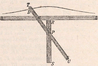c) konchoidograf Nikomedesa - to urządzenie pozwalające wykreślić figurę złożoną z punktów, które na każdej prostej przechodzącej przez ustalony punkt zwany biegunem są odległe od punktów danej prostej o tę samą wielkość (bliżej i dalej, co daje dwie gałęzie konchoidy); składa się z pręta z trzema otworkami, z których środkowy leży w środku odcinka utworzonego przez pozostałe dwa, w których umieszczone są rysiki; jeśli pręt oprzemy w ustalonym punkcie (biegunie konchoidy) i wodzimy nim tak, że przez środkową dziurkę widzieć punkty zadanej prostej, to rysiki wykreślą dwie gałęzie konchoidy tej prostej. Poniższy rysunek przedstawia inny model konchoidografu (rysujący tylko jedną - dalszą gałąź konchoidy), gdzie liniał AB pokrywa się z prostą, której konchoidę rysujemy, P jest biegunem konchoidy, a ruchomy pręt TU ma w punkcie D umieszczony rysik (CD to stałą odległość, o którą przesuwamy punkty prostej AB).