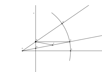 Uzasadnienie. Niech D jest punktem przecięcia EO z prostą f. Niech F jest srodkiem DE. Wówczas CF=DF (środkowa w trójkącie prostokątnym) oraz DF=OC (własność konchoidy). Stąd trójkąty OCF i CFE są równoramienne, a kąt CFD jest dwukrotnie większy niż FEC (jako zewnętrzny w trójkącie CFE). Kąty CEO i AOE są przystające (naprzemianległe). Stąd mamy, że kąt EOB jest dwukrotnie większy niż AOE, innymi słowy AOE jest trzecią częścią AOB, cnd.