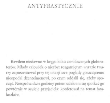 Zad. 2. Antyfraza to ironiczna zmiana znaczenia wyrazu na przeciwny. Zacytowany fragment jest antyfrastyczny, ponieważ – co widać w kontekście całości utworu – podróż autobusem w godzinach szczytu nie jest wydarzeniem towarzyskim, bynajmniej.