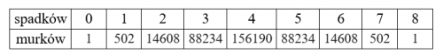 Kasia ułożyła wszystkie możliwe 9! murków z 9 klocków (o wysokościach 1, 2, 3, …, 9 cm) i zliczyła, w ilu murkach jest dana liczba spadków, otrzymując następujące wyniki:
