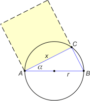 Niech x oznacza szukaną długość boku kwadratu o polu takim, jak pole koła o danym promieniu r. Kąt ACB jest wpisany i oparty na średnicy, więc jest prosty. Pole kwadratu o boku AC wynosi x2 = (2r·cosα)2, co ma być równe πr2. Obliczamy stąd cosα = 1/2·√π. Widać, że kąt α nie zależy od r, jest więc ten sam dla każdego koła i wynosi ok. 27°35'49,6".