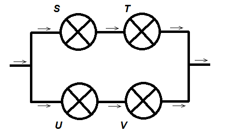 Jeśli przez FS, FT, FU i FV oznaczymy dystrybuanty czasów pracy poszczególnych żarówek (zgodnie z oznaczeniem z rysunku), to jak wyraża się dystrybuanta czasu pracy całego układu?