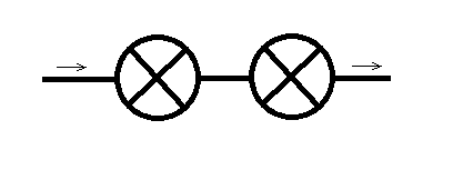 Inaczej sytuacja wygląda, gdy żarówki połączymy szeregowo. Schemat takiego połączenia jest przedstawiony na rysunku: