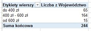 Możemy sobie postawić jeszcze inne pytanie związane z grupowaniem danych: Ile jest rodzin w bazie, których dochód mieści się w określonym przedziale? Powiedzmy, że interesują nas przedziały: do 400 zł, między 400 i 600 zł oraz powyżej 600 zł. Aby udzielić odpowiedzi na to pytanie, musimy utworzyć tabelę przestawną, w której w polu WIERSZE umieścimy dochód, a w polu WARTOŚCI cokolwiek, byleby zliczać rodziny. Powstała w ten sposób tabela przestawna jest zapewne mało estetyczna i jeszcze niewiele mówi, ponieważ każdej kwocie prawdopodobnie przypada tylko jedna rodzina. Niemniej teraz zaznaczając odpowiednie kwoty, możemy je zgrupować, by uzyskać interesującą nas informację. Następnie możemy wprowadzić dla grup własne etykiety i ostatecznie z pola WIERSZE tabeli przestawnej pozycję Dochód, pozostawiając jedynie pozycję Dochód2, na podstawie której dokonuje się grupowanie.