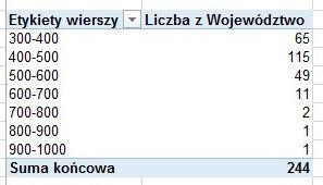 Jeśli grupowania dokonujemy na podstawie kolumny, w której są liczby, i chcemy dokonać grupowania na przedziały równej długości (np. po 100 zł), możemy dokonać tego w inny, nieco wygodniejszy sposób. Tworzymy tabelę przestawną jak powyżej, a następnie bez zaznaczania czegokolwiek klikamy prawym przyciskiem myszy na dowolne pole z dochodem i wybieramy Grupuj. Pojawi się okno, w którym Początek i Koniec oznaczają odpowiednio lewy koniec pierwszego przedziału i prawy koniec ostatniego przedziału. Domyślnie jako Początek ustawiono najmniejszy dochód w tabeli - w naszym wypadku jest to 333,48 zł - ale możemy to zmienić. Jeśli ustawimy Początek na kwocie 300 zł, wszystkie rodziny zmieszczą się do wyznaczonych przez nas przedziałów, a pierwszy z nich będzie liczony od 300 zł. (Jeśli jako Początek ustawilibyśmy kwotę większą niż najmniejszy dochód w tabeli, zostanie otworzony jeszcze jeden przedział dla wszystkich wartości mniejszych od tej kwoty). Długość przedziału ustawiamy, wpisując 100 w pole Według. Po zatwierdzeniu operacji przyciskiem OK otrzymujemy przejrzyste podsumowanie wraz z dochodem pogrupowanym w przedziały. Tutaj domyślne etykiety są już bardziej przejrzyste.