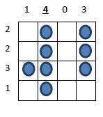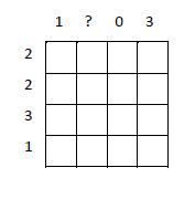 Zad. 2. Na niektórych polach poniższej planszy postawiono po jednym pionku do gry. Liczby w nagłówkach informują, ile pionków stoi w danym rzędzie lub kolumnie. Zaznacz krzyżykami pola, na których stoją pionki. Uzupełnij brakującą liczbę w drugiej kolumnie.